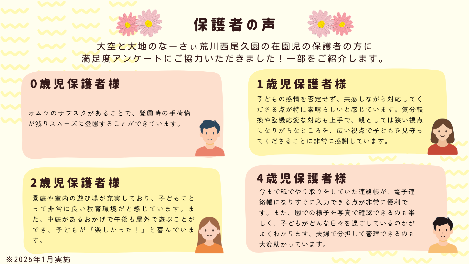 実際に通われている保護者の方からいただいた声を一部ご紹介です! 園生活の雰囲気や子どもの成長の様子を、ぜひご覧ください✨