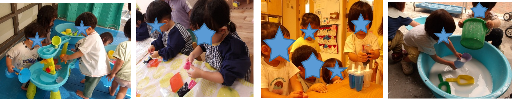 身近な素材である「水」にさまざまな形で触れる経験を通して、子どもたちは水の感触や動き、形の変化などに興味や不思議さを感じる姿が見られた。実際に手で触れながら繰り返し遊ぶ中で、「どうなるのだろう」と主体的に学びを深め(自ら使いたい道具や玩具を持ってくるなど)、集中して遊び込む姿も見られた。また、夏のプール遊びだけでなく、日々の保育の中で水に触れる機会を設けたことで、水への関心が高まり、遊びの中で満足感を得ている姿も見られた。さらに、友達と気付きを共有したり、道具の貸し借りをしたりする姿もあり、友達との関わりの広がりにもつながった。