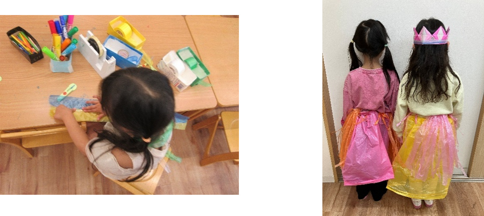 なりきりごっこ遊びでは、衣装を着てプリンセスになりきる中で、「ブレスレットとかネックレスも作りたい」と子ども達から声が上がり、どの素材を使うか、どうやって作るかを一緒に考えながら作り足していった。
