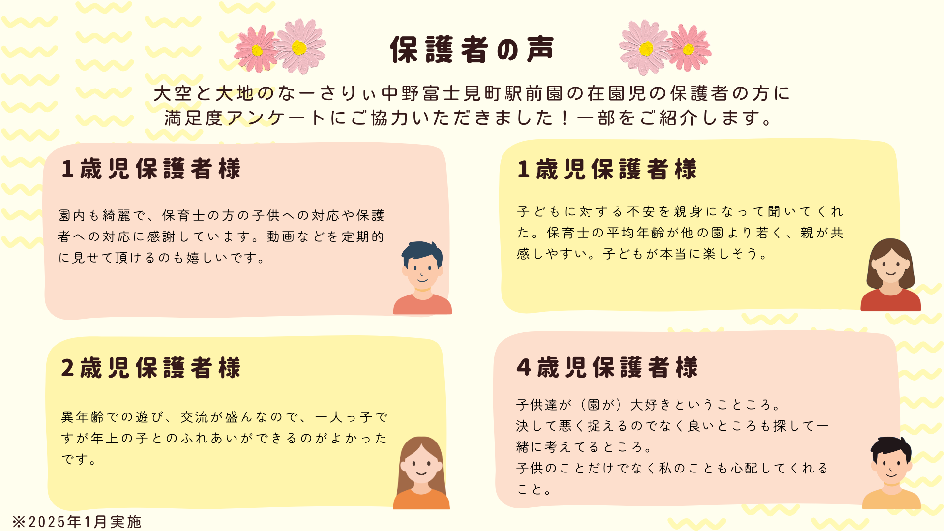 実際に通われている保護者の方からいただいた声を一部ご紹介です! 園生活の雰囲気や子どもの成長の様子を、ぜひご覧ください✨
