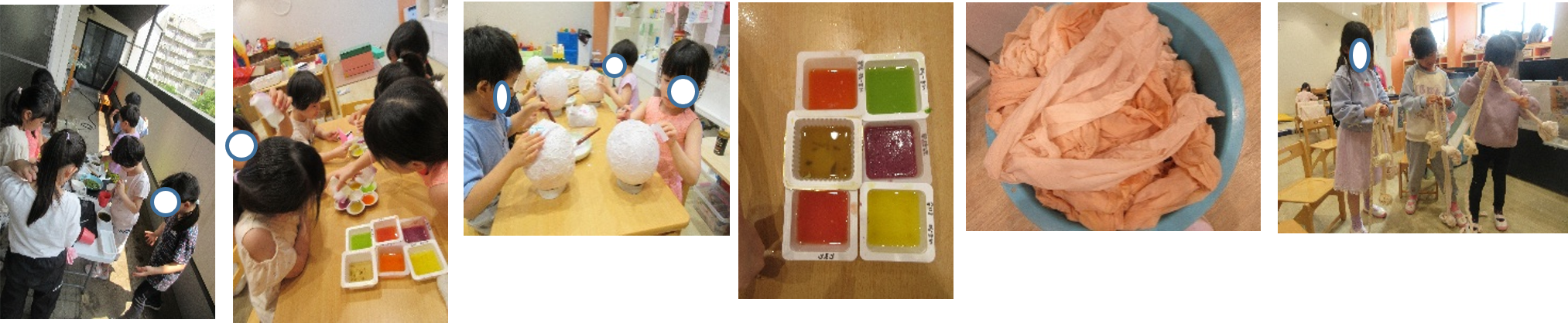 ・色水、玉ねぎの皮を使った染物へ発展 → 染物を使った製作活動へ広げる。