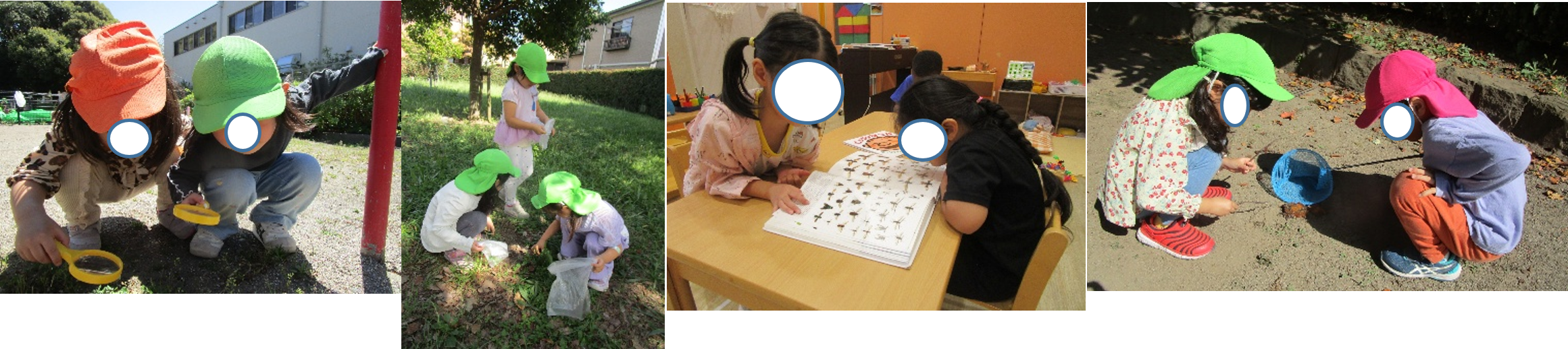 戸外での散策活動で発見したものを園に持ち帰り、自ら調べたり観察したりする中で、自然物への興味・関心が深まっていった。活動中に保育者へ気付きや発見を伝える姿や、友だち同士で会話が広がっていく様子が見られた。この活動を通して、身のまわりにある自然物に対して自ら気付き、発見を楽しむ児が増えたように感じる。この先も、さらに継続した遊びや活動を展開していきたいと思う。