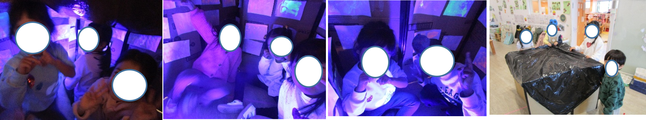 ・光る絵の具で作った作品を段ボール(土台)に貼り、ブラックライトを当てた。子どもたちが順番に段ボール(プラネタリウム)に入り、光の様子を観察したり、感じたことを友達と共有したりしながら体験的な活動を楽しんだ。