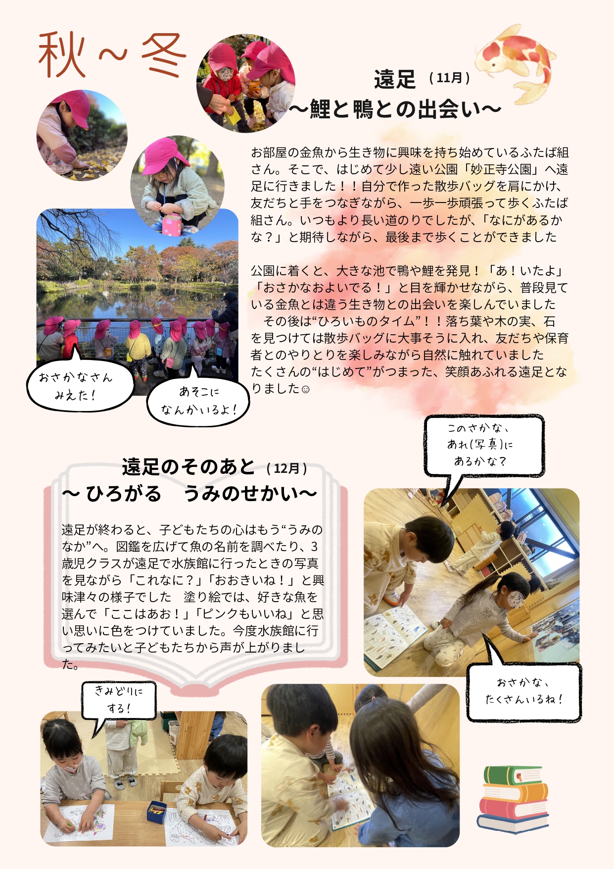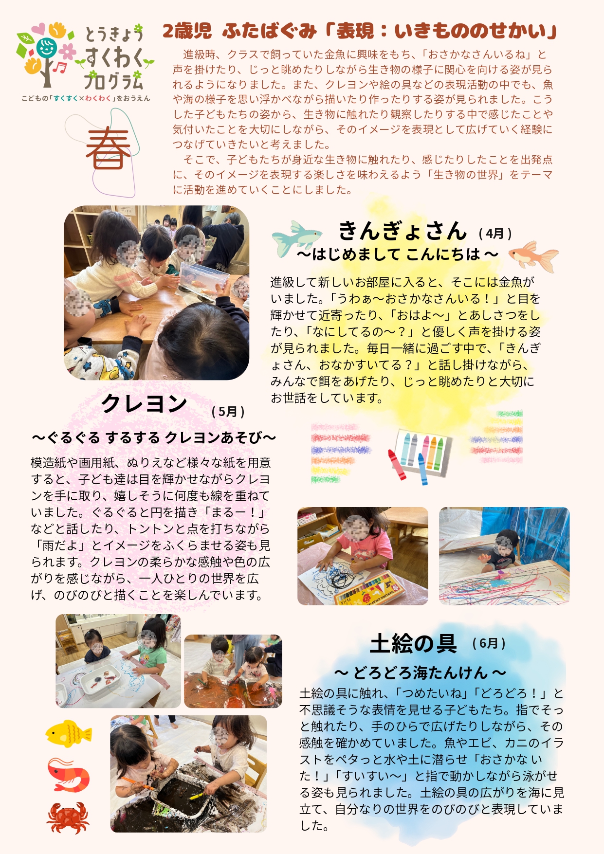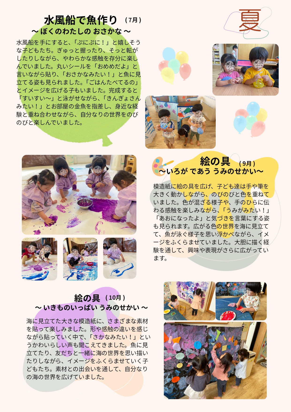 子どもたちは金魚との出会いをきっかけに生き物への興味を広げながら、さまざまな活動を楽しむことができた。クレヨンや絵の具、素材を使った製作の中では、生き物や海の世界を思い浮かべながら、自分なりの表現を楽しむ姿が見られた。その後、公園への遠足や水族館で実際の生き物に出会う経験を通して、子どもたちの関心はさらに広がっていった。