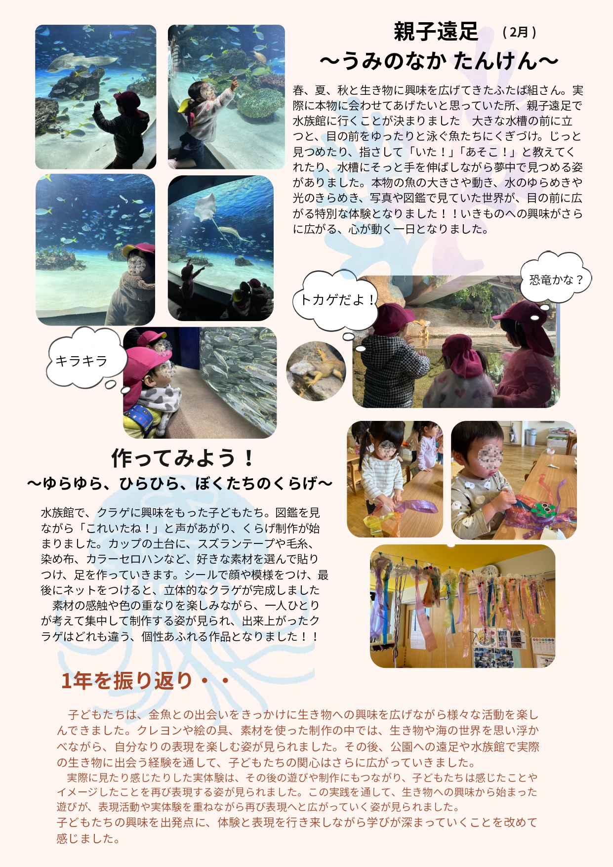 保育室で飼育している金魚を身近な生き物として、日常的に観察できる環境を整えながら探究活動を行った。子どもたちは水槽をのぞき込み、金魚の動きや様子に関心を持ち、気付いたことを言葉にして保育者や友だちに伝える姿が見られた。また、水族館への遠足を通してさまざまな魚を実際に見る経験を重ねることで、生き物への興味や関心をさらに広げていった。その後の保育では海や魚をイメージした製作活動を取り入れ、描く・貼るなどの表現活動を通して体験したことを遊びや表現へとつなげていった。